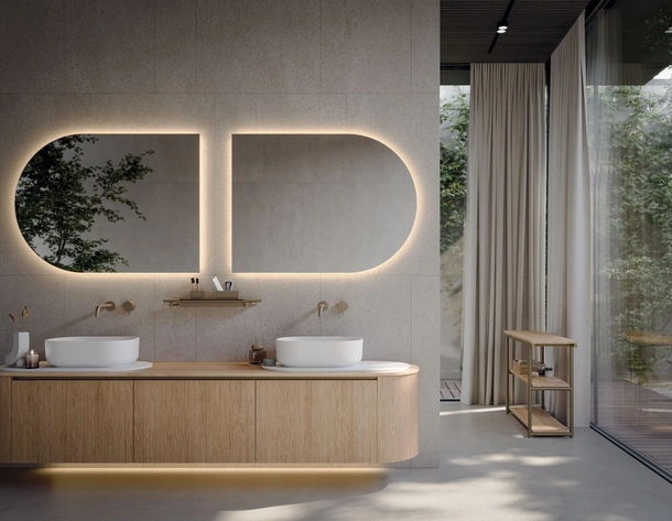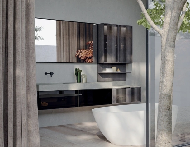 Mobili bagno sospesi in HPL del brand Novello: clicca e scopri l'arredo bagno moderno Libera+ 08 per la stanza del benessere.