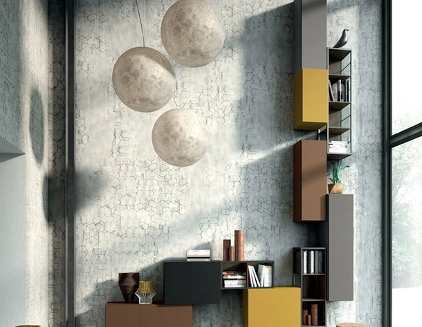 Texture di pregio e linee decise: scopri la libreria Rebel R09 di Fimar tra le più belle Librerie moderne sospese.