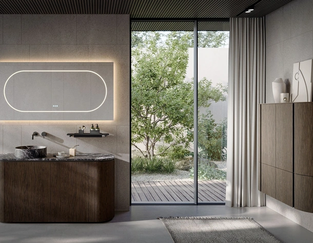 Arreda la stanza del benessere design ottimamente con Elle 02, mobili bagno a terra e accessori in legno di Novello.